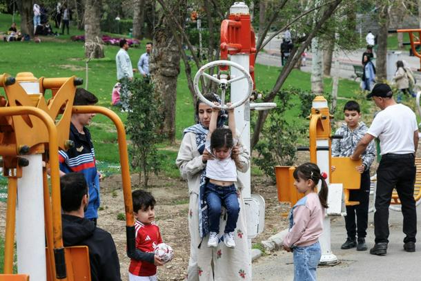 Despite the ongoing bombardment in Iran, families gathered in Tehran’s Melat Park, with men smoking water pipes and children playing to mark the 13th day after Nowruz, the Persian New Year, when people traditionally picnic outdoors.