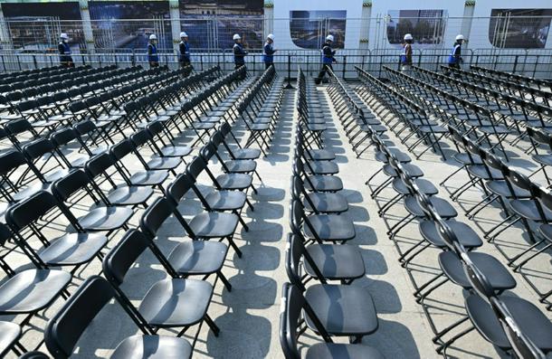 Workers walk past rows of chairs set up for the comeback concert of K-pop boy group BTS at Gwanghwamun Square in Seoul on March 20, 2026.