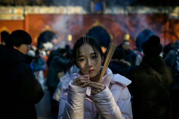 A woman burns incense sticks and offers prayers at Yonghe Temple, also known as Lama Temple, on the first day of the new year in Beijing on January 1, 2026