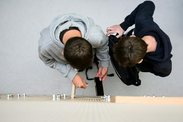 Students place their phones in lockers after switching them off at a highschool in Lorient
