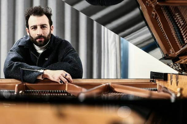 Julien Cohen can be seen leading the troupe of 30 performers on a grand piano