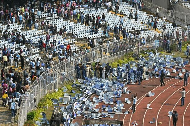 Disappointed fans pelted security officials with chairs ripped from the stadium