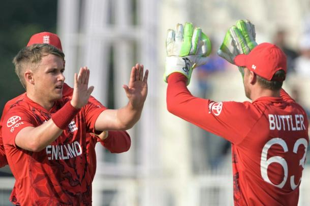 England's Sam Curran (L) celebrates with Jos Buttler after taking the wicket of Scotland's Michael Jones
