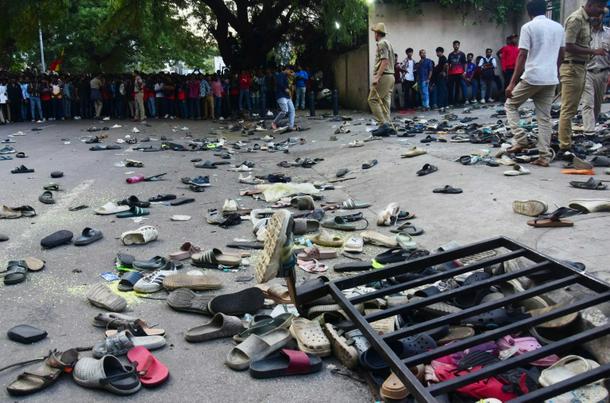 Fans stand next to abandonned shoes and a fallen barrier outside M. Chinnaswamy Stadium