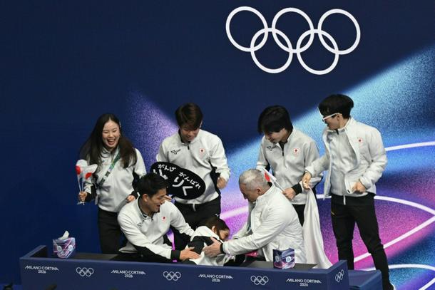 Japan's Riku Miura (front C) falls over in shock after seeing her career-high score in the Olympic pairs free skating team event with partner Ryuichi Kihara (front L)