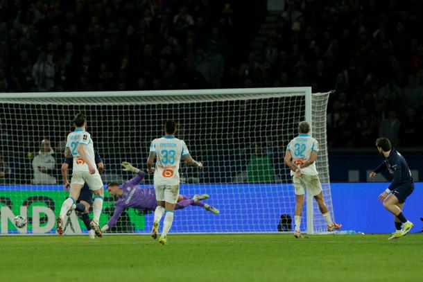 PSG surged in front moments later as Desire Doue released Nuno Mendes with a superb ball down the left and the Portuguese wing-back squared for Dembele to slot past Marseille goalkeeper Jeffrey de Lange.