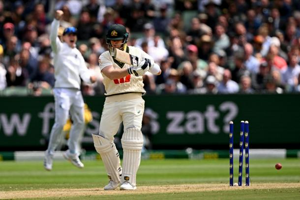 Jake Weatherald tickled down the leg side to wicketkeeper Smith on 10 in Tongue’s first over.