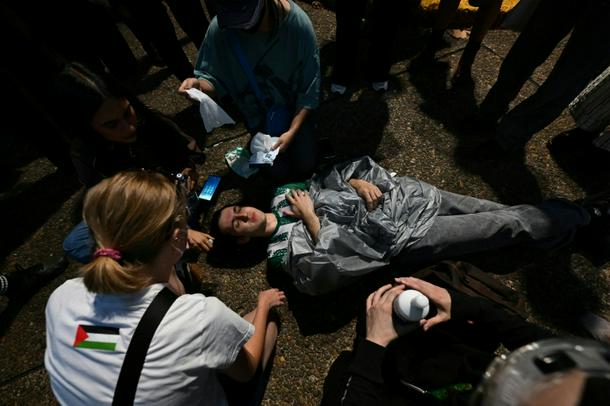 A protester is helped after police deployed pepper spray to disperse demonstrators taking part in a Pro-Palestinian rally against Israeli President Isaac Herzog's visit to Australia in Sydney on February 9, 2026