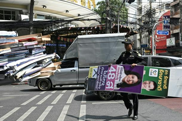 Bangkok Metropolitan Administration workers take down election posters a day after the general election in which the Pheu Thai was projected to come third