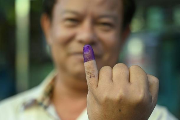 A voter shows an inked finger after casting a ballot