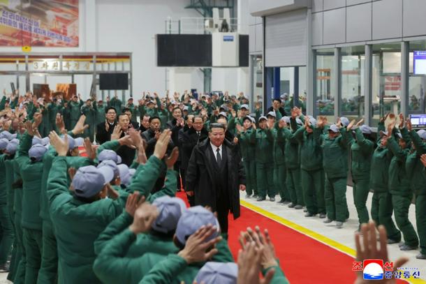 Images released by Pyongyang showed a stern-looking Kim delivering a speech at the venue in Hamgyong Province in the country’s frigid northeast, with workers in attendance wearing green uniforms and matching grey hats.