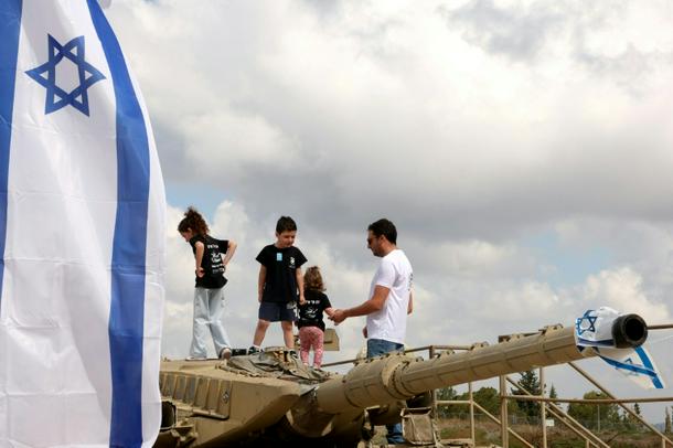Children climb atop old tanks at the Israeli Armoured Corps memorial in Latrun, between Jerusalem and Tel Aviv