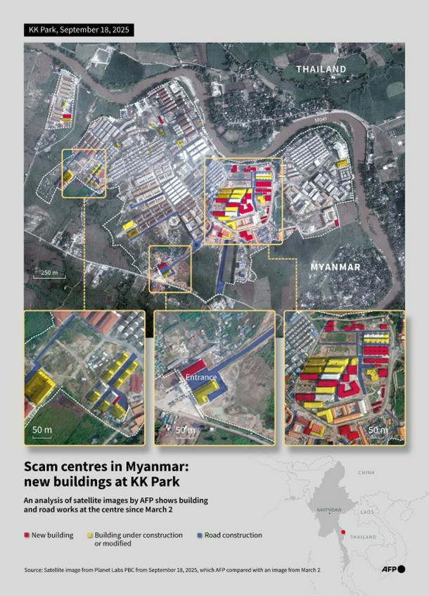 AFP analysis of satellite images from Planet Labs PBC found dozens of buildings going up or being altered in the largest of the compounds, KK Park, between March and September.