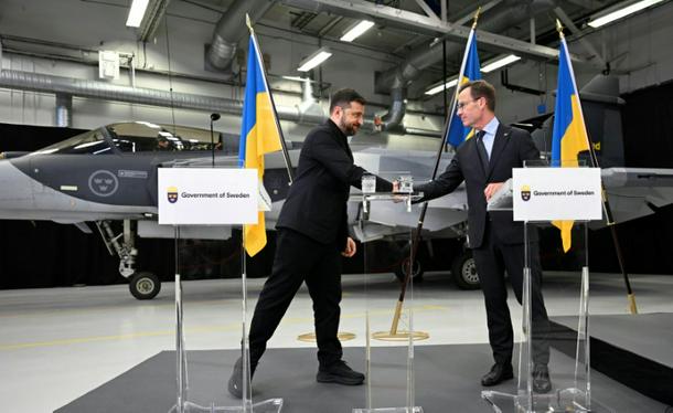 Ukrainian President Volodymyr Zelensky signs a letter of intent with Swedish Prime Minister Ulf Kristersson to get 150 Gripen fighter jets